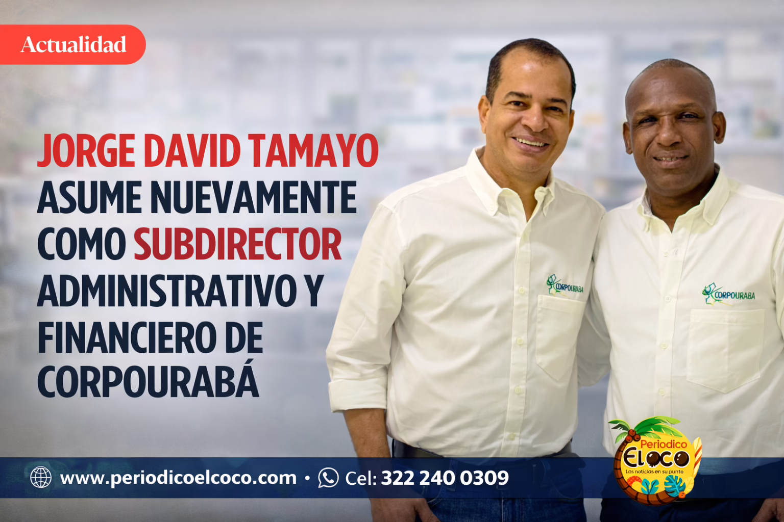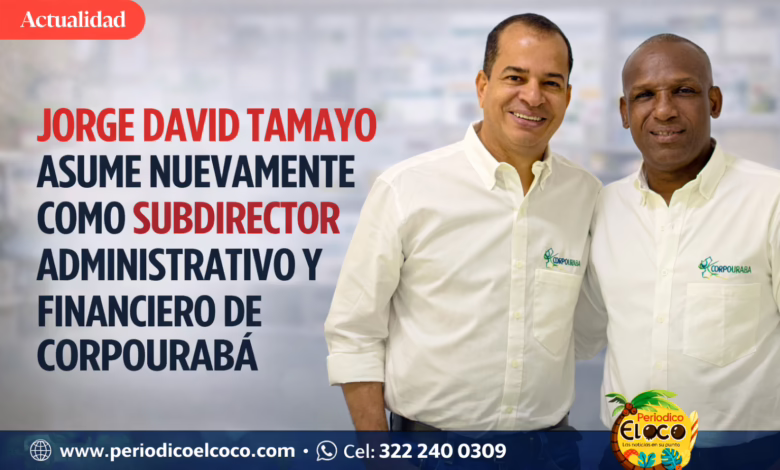 La Corporación para el Desarrollo Sostenible del Urabá (Corpourabá) oficializó el retorno del contador público Jorge David Tamayo a la Subdirección Administrativa y Financiera. Este movimiento se produce tras la culminación satisfactoria de su periodo como Director Encargado, rol en el que demostró su capacidad de liderazgo y solvencia técnica.